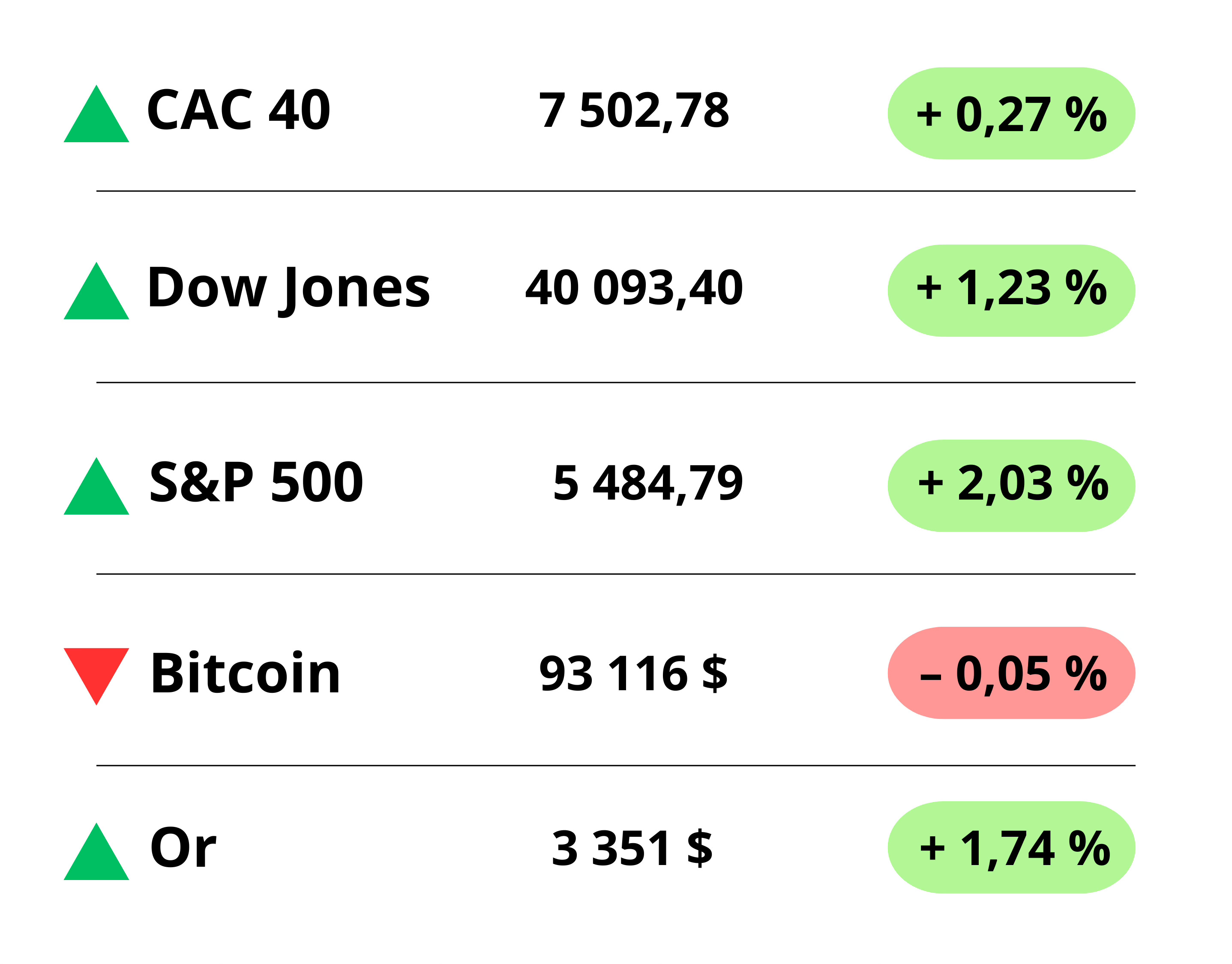 Wall Street đŠ TroisiĂšme jour de hausse dâaffilĂ©e pour les marchĂ©s amĂ©ricains : le Nasdaq bondit de 2,7%, le S&P 500 de 2,1% et le Dow Jones gagne 500 points. En cause ? Un vent dâoptimisme sur les nĂ©gociations commerciales de Trump, notamment avec lâInde et la CorĂ©e du Sud, et lâespoir dâune baisse des taux dĂšs juin. Les stars de la tech en profitent : Apple, Amazon, Nvidia ou Microsoft montent en flĂšche. Prochaine Ă©tape : les rĂ©sultats dâAlphabet et dâIntel, trĂšs attendus pour voir si la guerre des droits de douane commence Ă peser sur leurs chiffres.