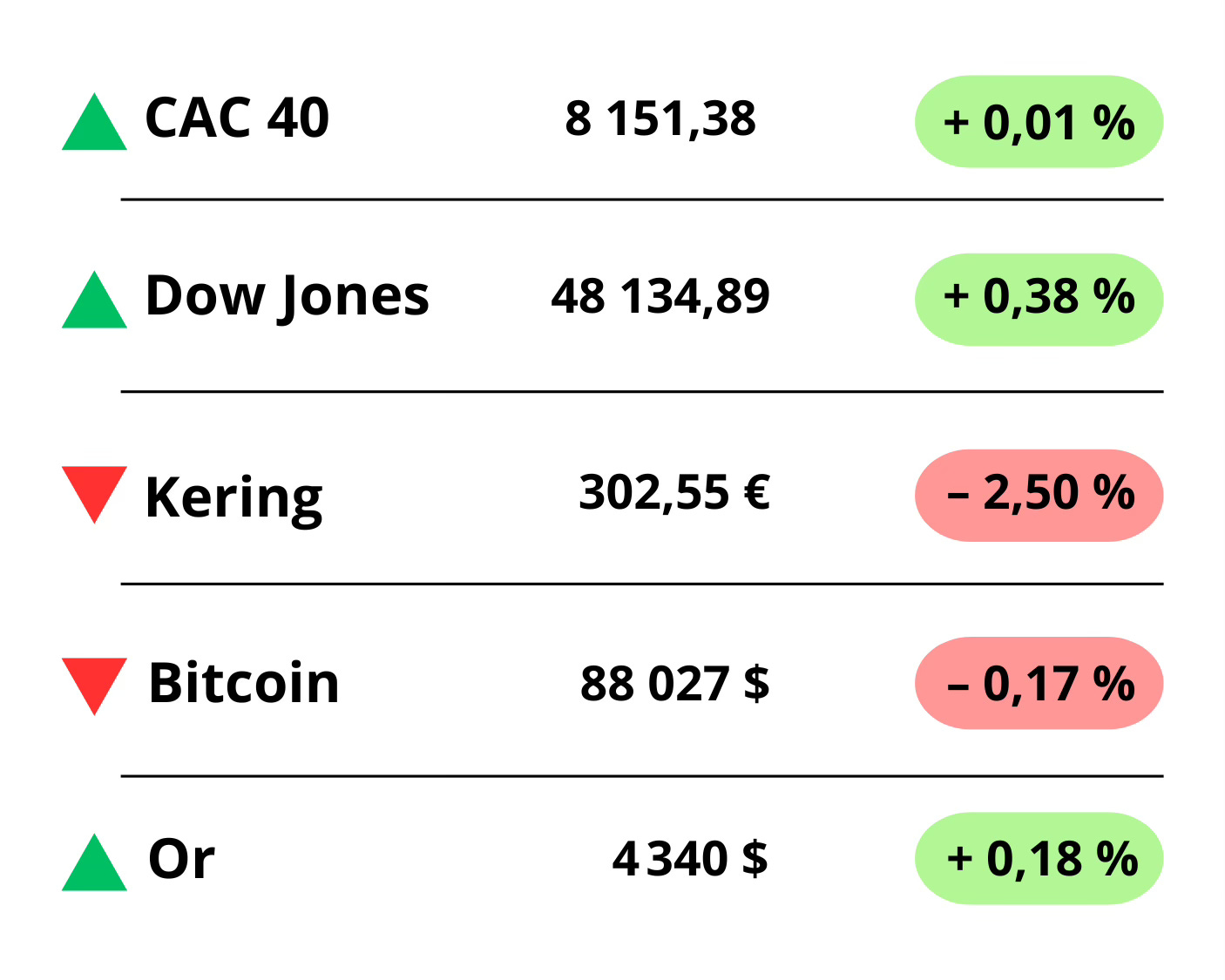 MarchĂ©s đŠ Peu dâentrain vendredi Ă la Bourse de Paris : le CAC 40 termine quasi stable (+0,01 %), mais gagne 1 % sur la semaine. CĂŽtĂ© valeurs, Kering chute de 2,5 %, pĂ©nalisĂ© par une nouvelle dĂ©gradation du marchĂ© chinois.