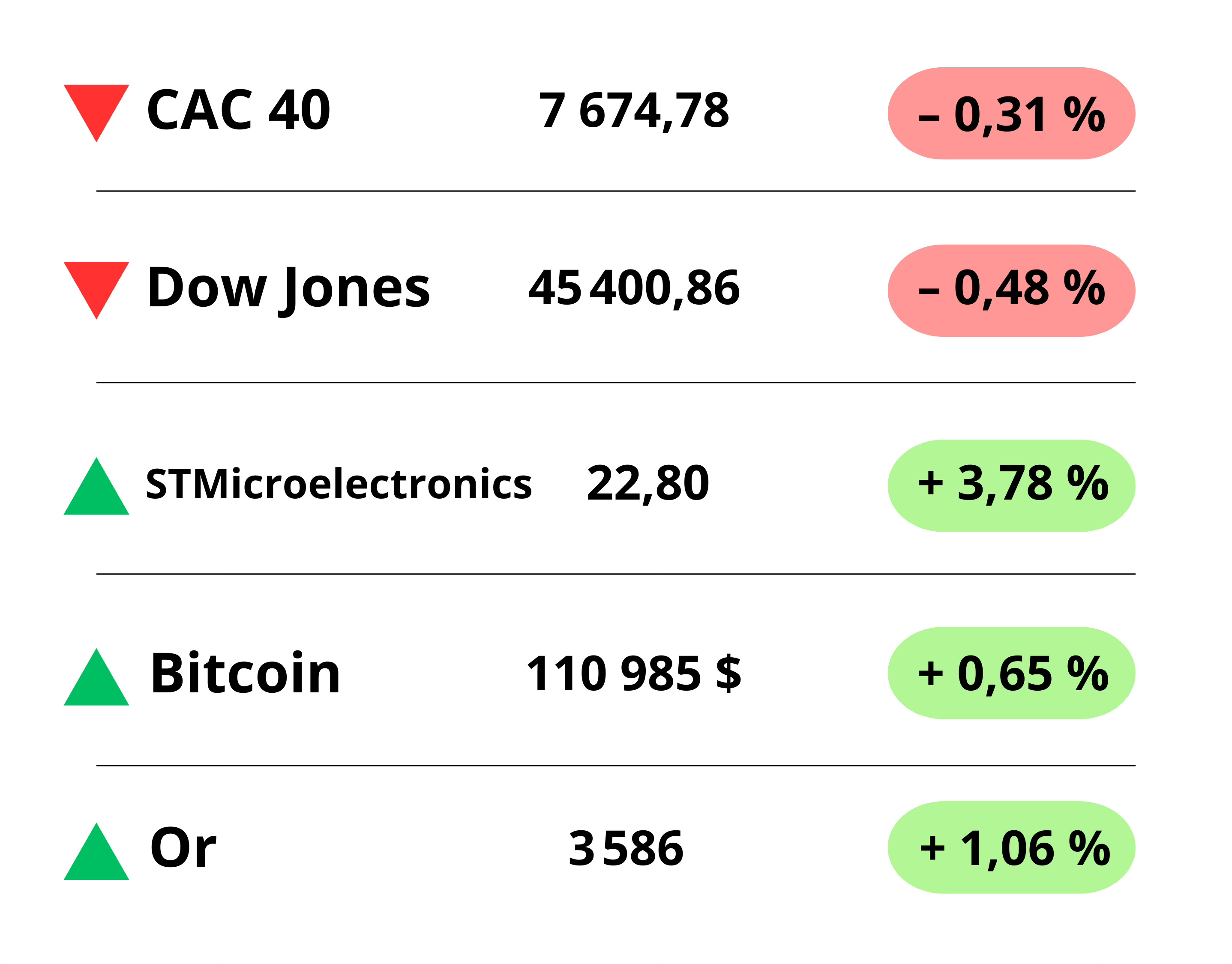 MarchĂ©s đŠ Le CAC 40 baisse de 0,3 % aprĂšs des chiffres de lâemploi amĂ©ricain trĂšs dĂ©cevants : seulement 22.000 postes créés en aoĂ»t au lieu des 75.000 attendus. Les marchĂ©s y voient la confirmation dâune prochaine baisse des taux de la Fed, mais aussi un signe de faiblesse de lâĂ©conomie amĂ©ricaine, ce qui fait chuter les banques. CĂŽtĂ© valeurs, STMicroelectronics grimpe de 3,8 % grĂące Ă la bonne santĂ© du secteur des puces, tandis quâAirbus recule de 1,6 %, toujours freinĂ© par des problĂšmes de moteurs sur lâA320.